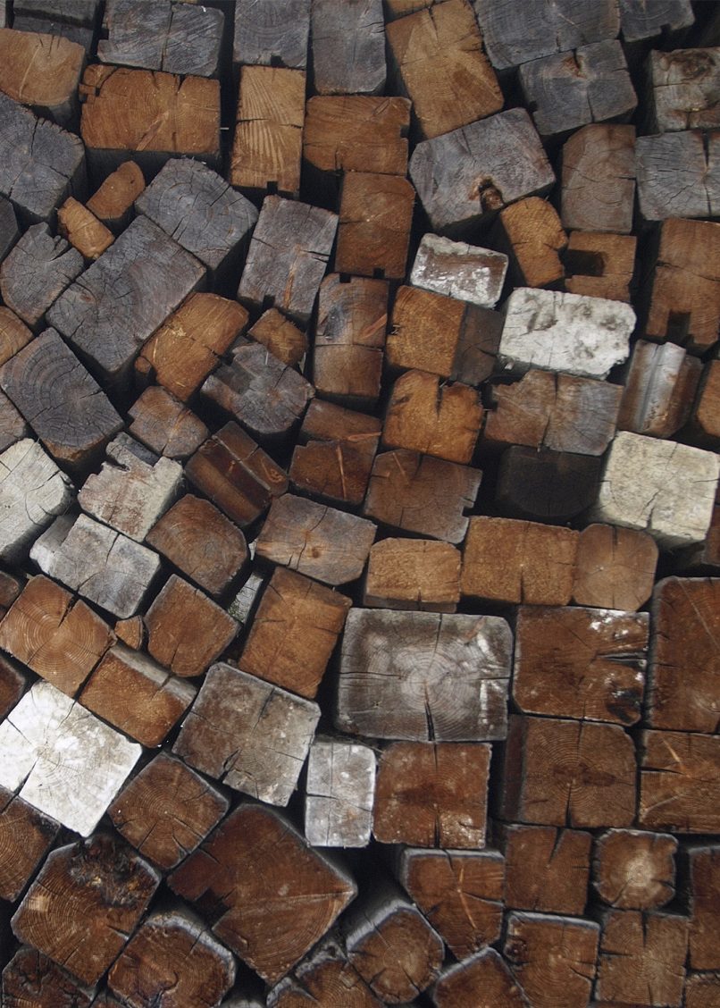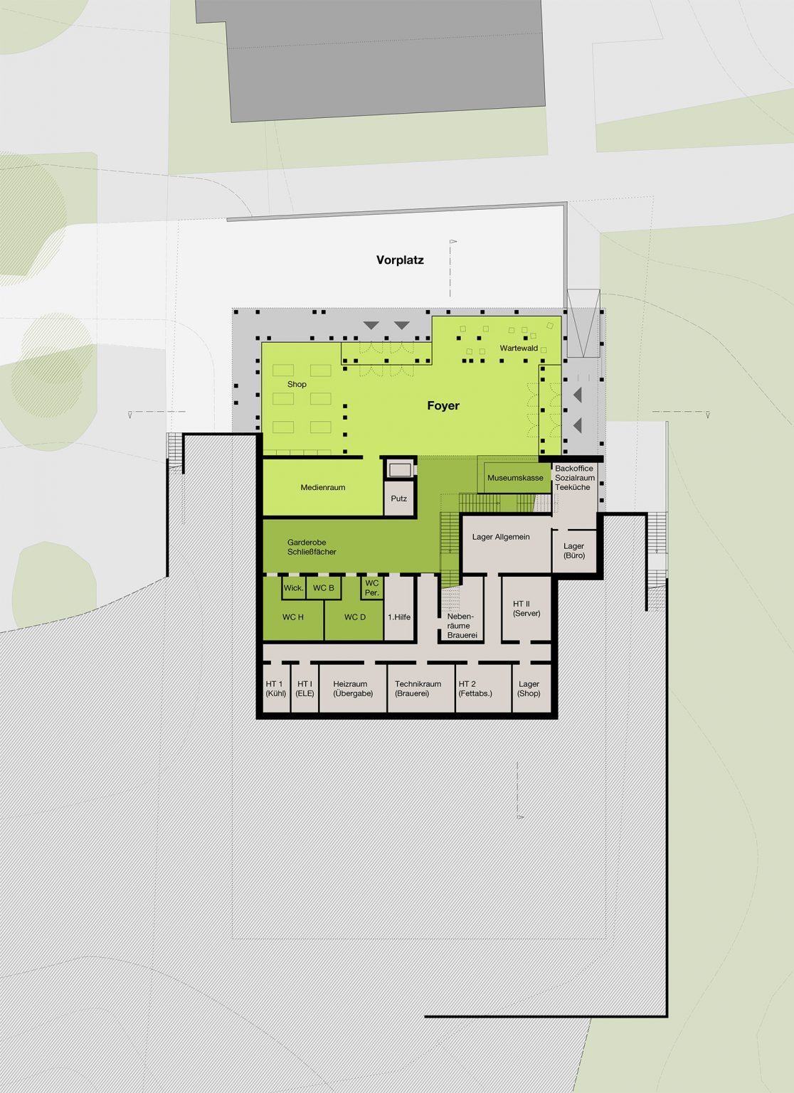 Die Baumstämme bilden sich ab in Vollholzstützen, welche die Deckenelemente aus Holz im Fassadenbereich tragen. Hierfür werden unverleimte Vollholzquerschnitte verwendet. Diese werden aus Holzstämmen geschnitten, sich an den Rändern abzeichnende Rindenrundungen zeugen von ihrer Herkunft. Überlagerte Reihen mit unregelmäßigen Abständen generieren das Bild des Waldes. Wie zwischen den Bäumen hindurch entsteht ein Filter, der je nach deren Abstand unterschiedlich durchlässig ist. Steht der Besucher in der Mitte des Raums nimmt er die Stützen als Wald war. Er ist beschützt und hat doch einen Ausblick. Tritt er näher an den Waldrand Richtung Fassade richtet sich der Blick auf die Landschaft und die Umgebung.