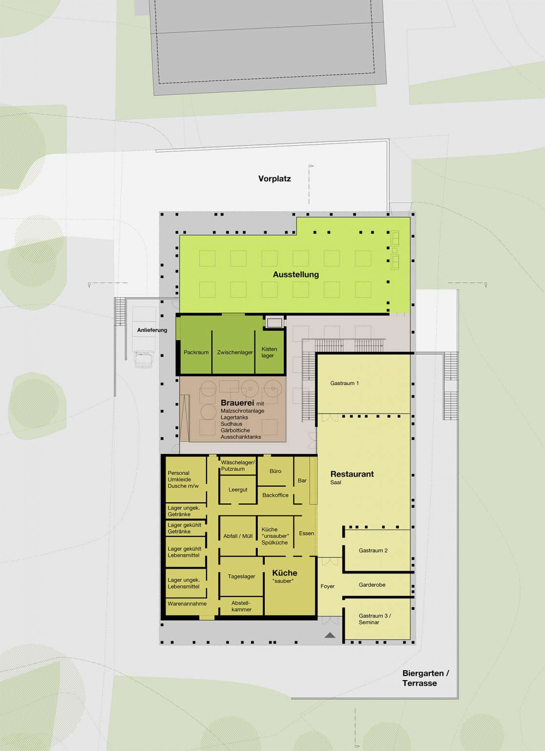 Die unverleimten und unbehandelten Holzstützen der Tragstruktur ließen sich theoretisch auch vor Ort in Glentleiten herstellen: Ein paar der Stützen – z.B die des Eingangsbereichs – werden wie zu Zeiten des alten Sägewerks produziert. Die Bäume werden im Winter geschlagen und nach einer Trocknungszeit zum Sägewerk gezogen. Dort werden sie zurecht gesägt und mit Pferdewagen zum Bauplatz transportiert, aufgestellt und mit einem Richtfest gefeiert. Damit würde anschaulich, wie die alten Produktionsprozesse, wenn auch heute nicht mehr wirtschaftlich, den Grundstock liefern für unsere heutige Technik.