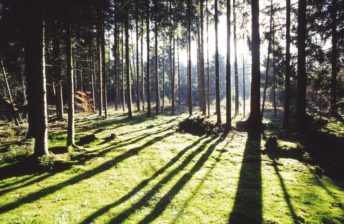 Entwurfsbestimmend war das Thema des Waldes: Baumstämme, die mal eng, mal weit zueinander stehen und das Licht einfallen lassen.