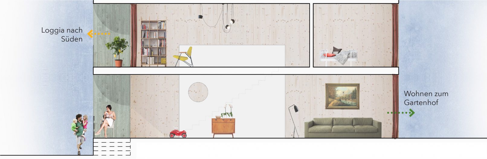 Die Machbarkeitsstudie bietet in zwei Baukörpern 30 Wohnungen vielfältigster Typologien, wie Geschosswohnungen und Maisonetten für generationenübergreifendes und familienfreundliches Wohnen. Ergänzt wird das Angebot um eine Groß-WG.