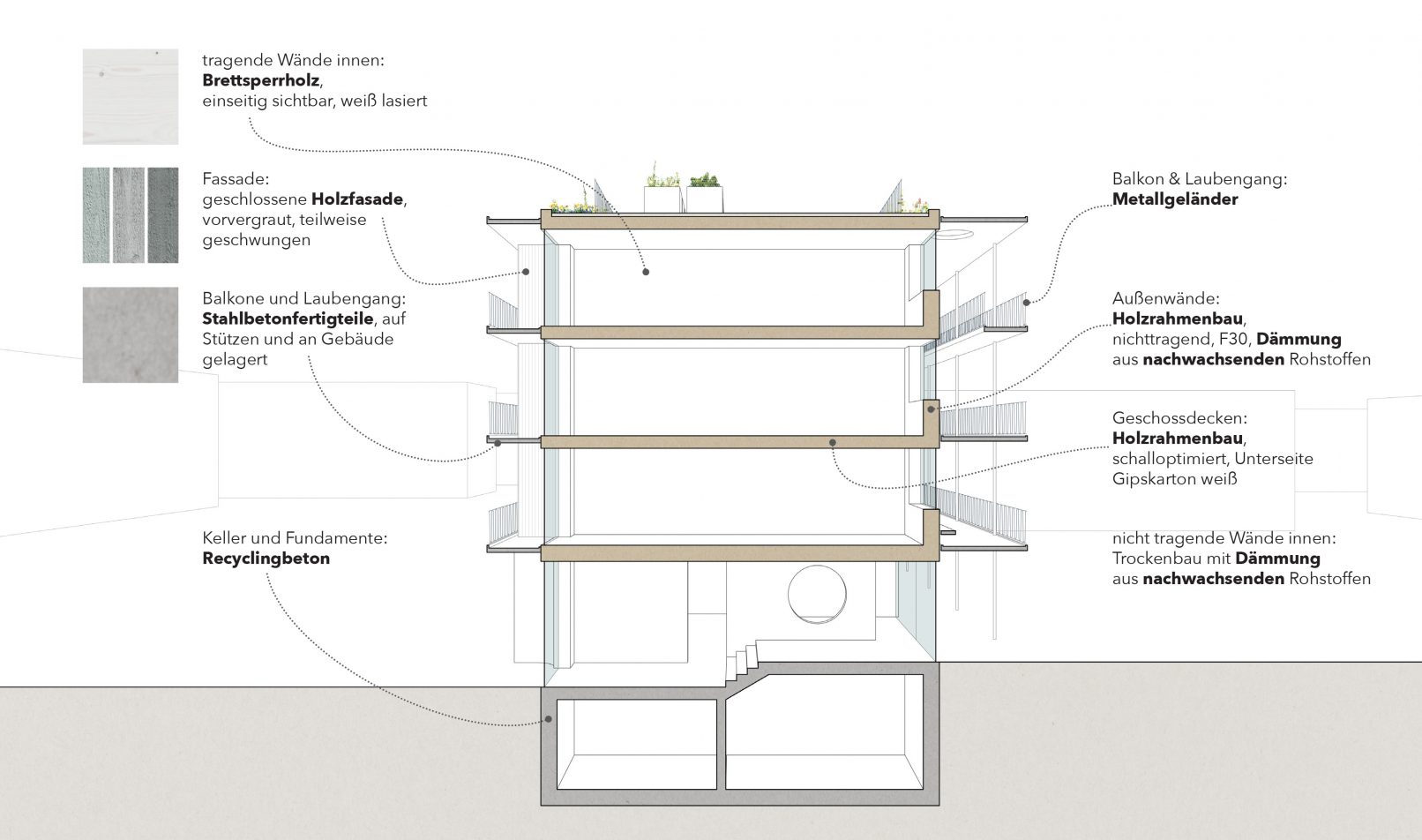 Die Wirtschaftlichkeit und ökonomische Nachhaltigkeit der Holzbauweise wird erzielt, indem gleiche Wohnungstypen stringent übereinander angeordnet werden, was z.B. Querverzüge der Installationen erspart. Eine kompakte Gebäudehülle mit einer einfach konstruierten Fassade ist kostengünstig in der Herstellung, und bietet dennoch einen Mehrwert für vielfältige Aneignung durch die BewohnerInnen.