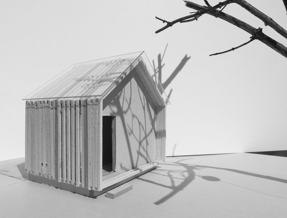 Drei massive Wandscheiben gliedern eine Struktur aus verzahnten Kanthölzern, die die Grundform des Baukörpers umfassen. Ihre Zwischenräume sind in einem Teil der Wandelemente ausgefüllt durch je ein weiteres Kantholz, um eine geschlossenen Fassade zu erzeugen. An anderen Situationen bleiben sie offen und erzeugen ein Spiel von Licht und Schatten, das den Innenraum erfüllt und auch Durchblicke und Außenbezüge schafft. Hier tritt das Innere der Kapelle in Interaktion mit der Außenwelt und lädt ein, einzutreten.