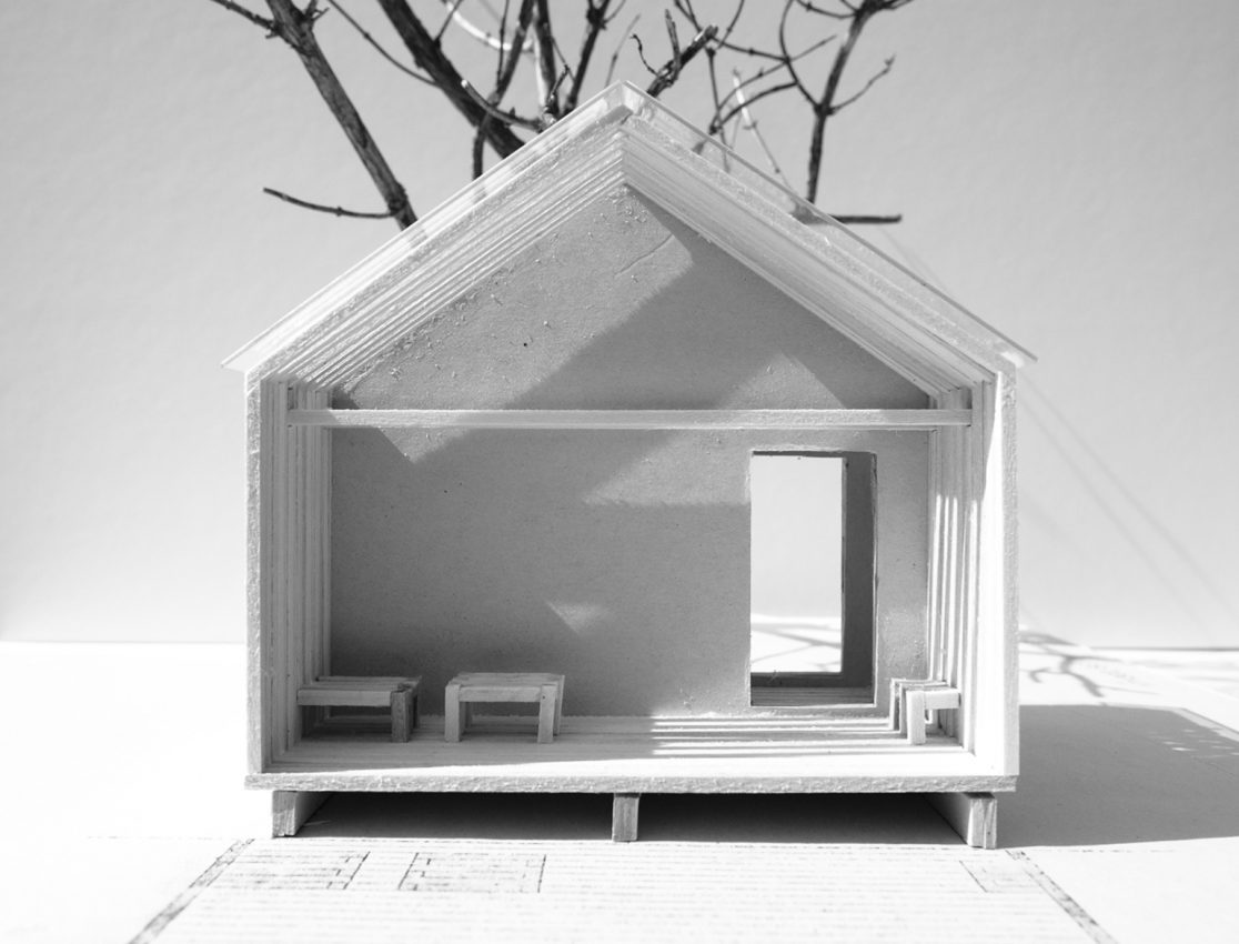 Die auskragenden Holzelemente der Kapelle bieten Sitzgelegenheit und Treffpunkt im Schatten des Ahornbaums, ein Ruhepunkt im Zentrum des dörflichen Lebens.